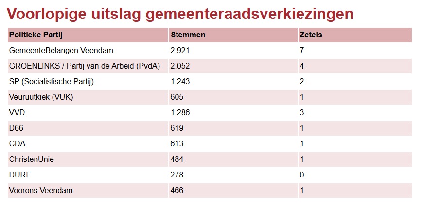 Op woensdag 18 maart 2026 zijn de gemeenteraadsverkiezingen gehouden in de gemeente Veendam. Inwoners en stemgerechtigden uit ons gebied hebben hun stem uit kunnen brengen in Dorpshuis de Molenwiek. De voorlopige uitslag is bekend. Het opkomstpercentage in de gemeente Veendam was 46,92%.